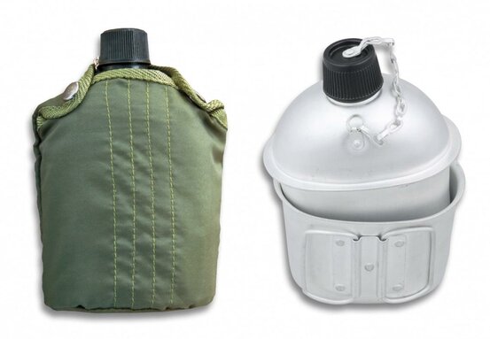 Klasszikus mezei palack bögrével és övre rögzíthető tokkal.